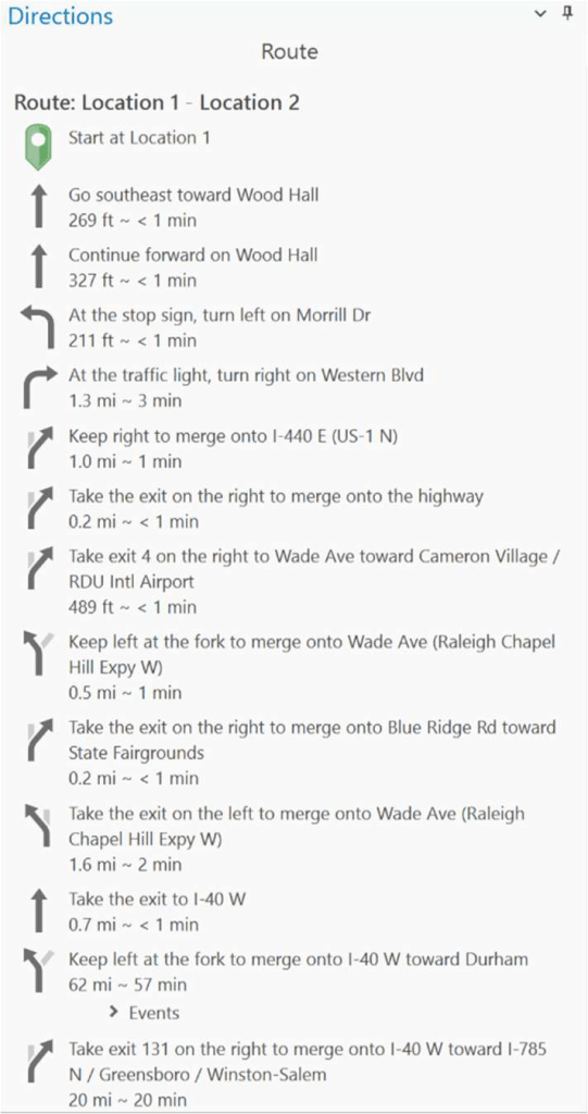 A network route analysis layer was then created using user-defined origin and destination coordinates. The script programmatically added route stops, solved the network, and generated points along the route at regular distance intervals corresponding to half of the vehicle’s maximum driving range. Charging stations located within a specified buffer distance of the route were selected and copied to a new feature class. These candidate charging locations were symbolized alongside the route and range markers, and turn-by-turn driving directions were generated automatically. Object-oriented programming was used to encapsulate routing and charger-selection logic within a custom EVRoutePlanner class, improving code readability and extensibility.