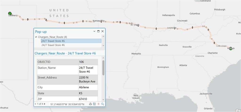 The final output of the project is a fully automated ArcGIS Pro script tool that produces a mapped EV travel route, identifies viable charging stations near the route, displays range-based interval markers, and generates turn-by-turn driving directions. The tool successfully integrates large national datasets with network analysis and spatial filtering to provide actionable travel guidance. Results are visualized directly in the map interface, allowing users to inspect individual charging station attributes such as connector counts, charging speed, and location context. The workflow demonstrates how GIS programming can bridge raw infrastructure data and practical transportation decision-making.